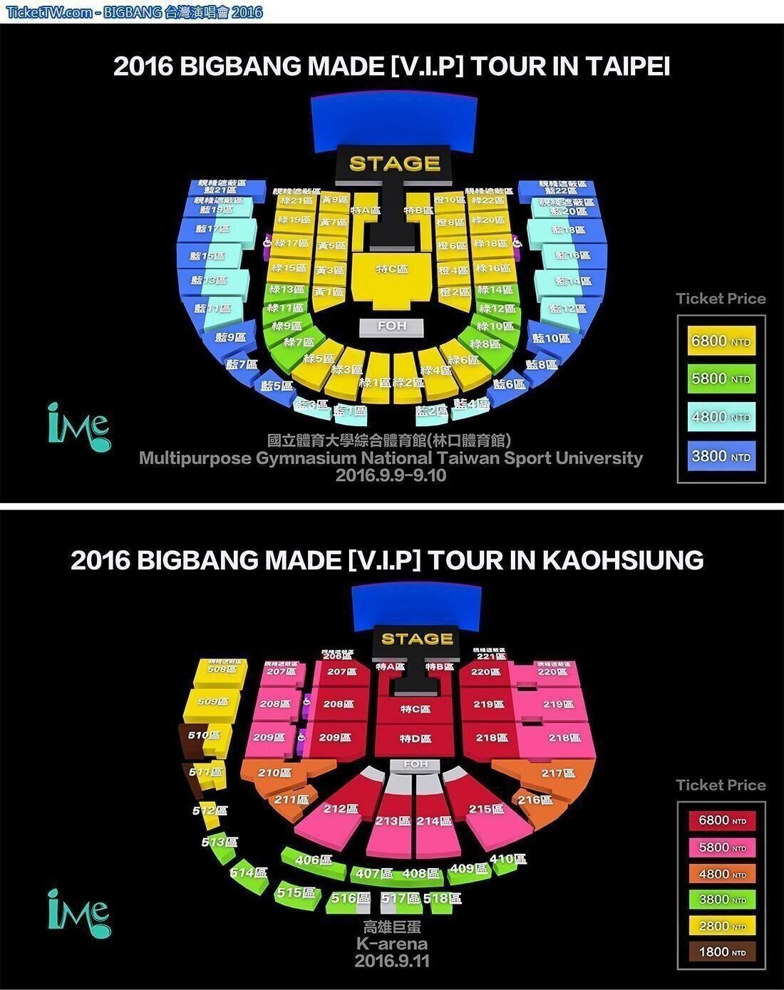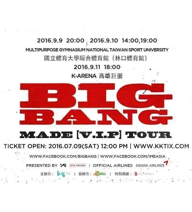 BIGBANG 台灣演唱會 2016, 演出日期: 2016年9月9日 - 11日 (共4場), 門票價錢: NT 6800 / 5800 / 4800 / 3800, 演出場館: 高雄巨蛋, 公開發售: 2016年7月9日12:00起 KKTIX