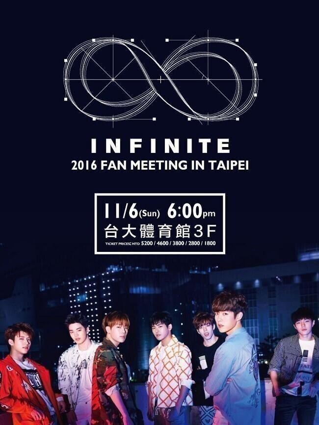 INFINITE 台灣粉絲見面會 2016, 演出日期: 2016年11月6日 (星期日), 門票價錢: NT$ 5200 / 4600 / 3800 / 2800 / 1800, 演出場館: 台北小巨蛋, 全面開賣: 2016年9月17日09:00起