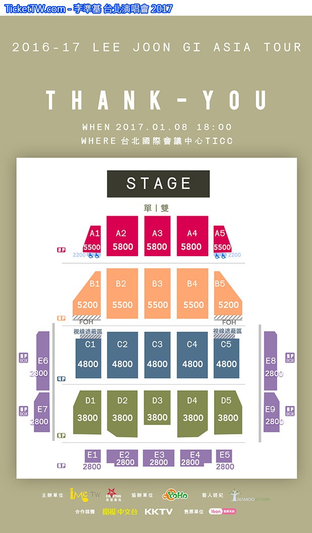 票價: NT$5800/ NT$5500 / NT$5200 / NT$4800/ NT$3800/ NT$2800/ (全場對號入座)