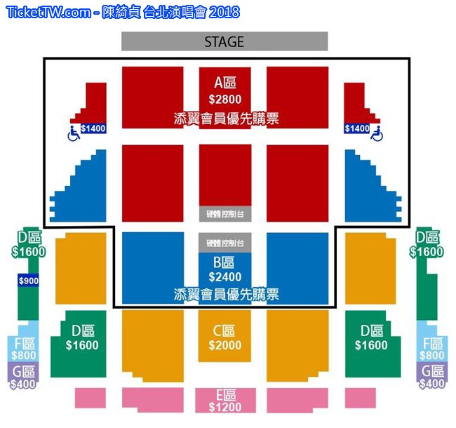 票價: A區 NT$2800 / B區 NT$2400 / C區 NT$2000 / D區 NT$1600 / E區 NT$1200 / F區 NT$800 / G區 NT$400(對號入座)