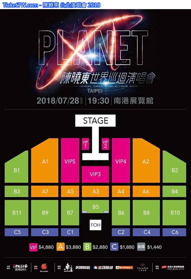 票價 VIP區 台幣4880 / A區 台幣3880 / B區 台幣2880 / C區 台幣1880