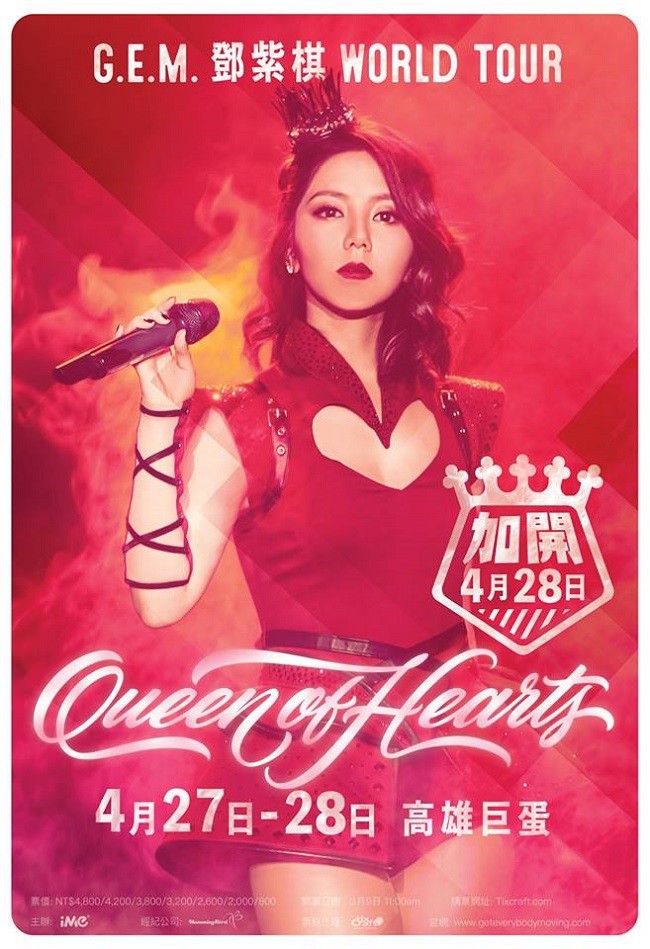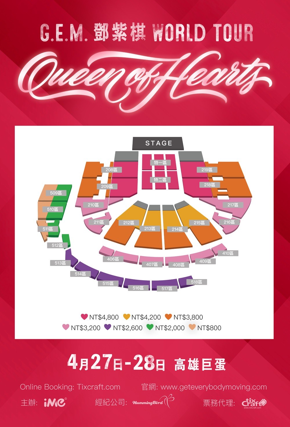 IME娛樂集團將再次把G.E.M.鄧紫棋”Queen of Hearts”世界巡迴演唱會帶到高雄,並於4月27日在高雄巨蛋開唱,國際製作的華麗舞臺,讓您感受視覺與聽覺同時震撼,絕對讓您『心跳加速』、血脈噴張!鐵粉們及上次無緣搶到票的粉絲們,千萬別錯過 ~~~
