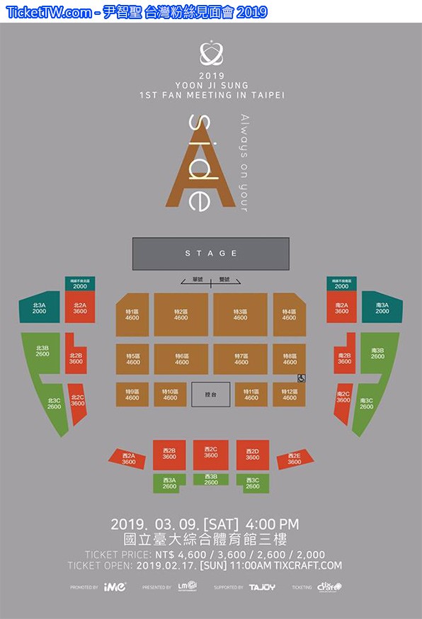 ※票價: NTD 4600 / 3600 / 2600 / 2000 (全場座席,對號入座)