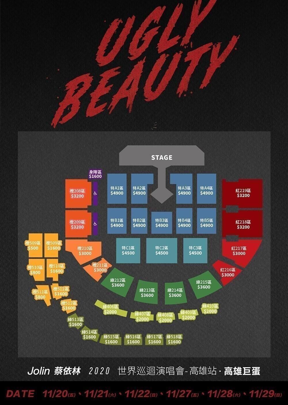 蔡依林 高雄演唱會 2020, 演出日期: 2020年11月20日 - 29日 (共6場), 門票價錢: NT 4900 / 4500 / 3600 / 3200 / 3000 / 2000 / 1600 / 800 / 500, 演出場館: 高雄巨蛋, 公開發售: 2020年10月24日13:26起 KKTIX