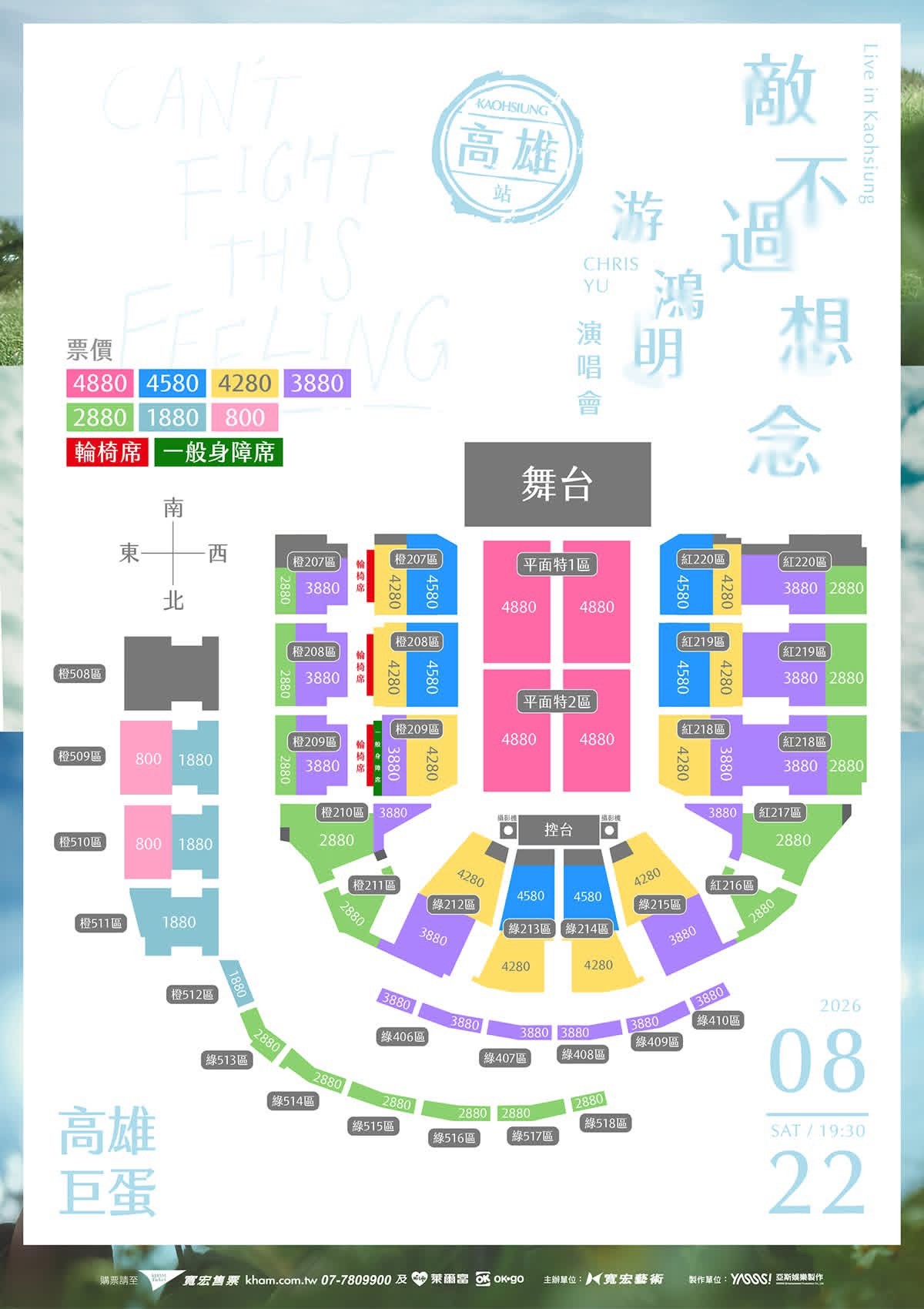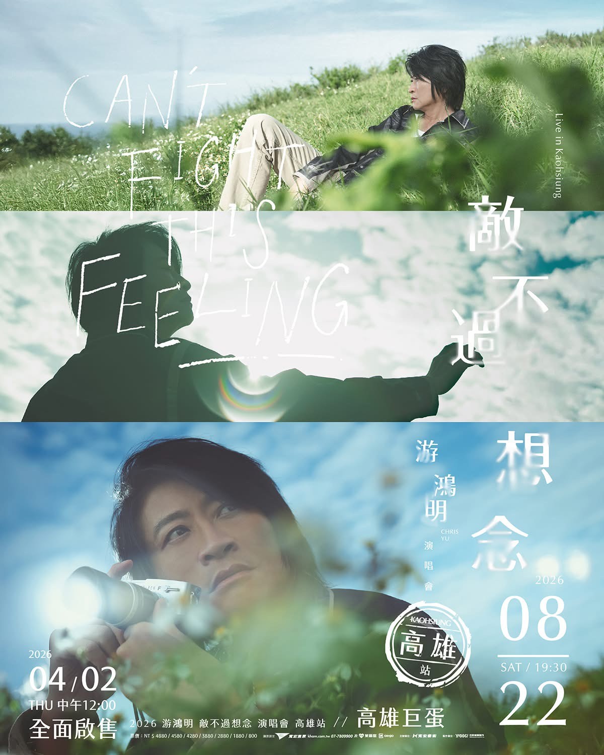 游鴻明 高雄演唱會 2026, 演出日期: 2026年8月22日 (星期六), 門票價錢: NT$ 4880 / 4580 / 4280 / 3880 / 2880 / 1880 / 800, 演出場館: 高雄巨蛋, 全面開賣: 2026年4月2日12:00起 寬宏售票